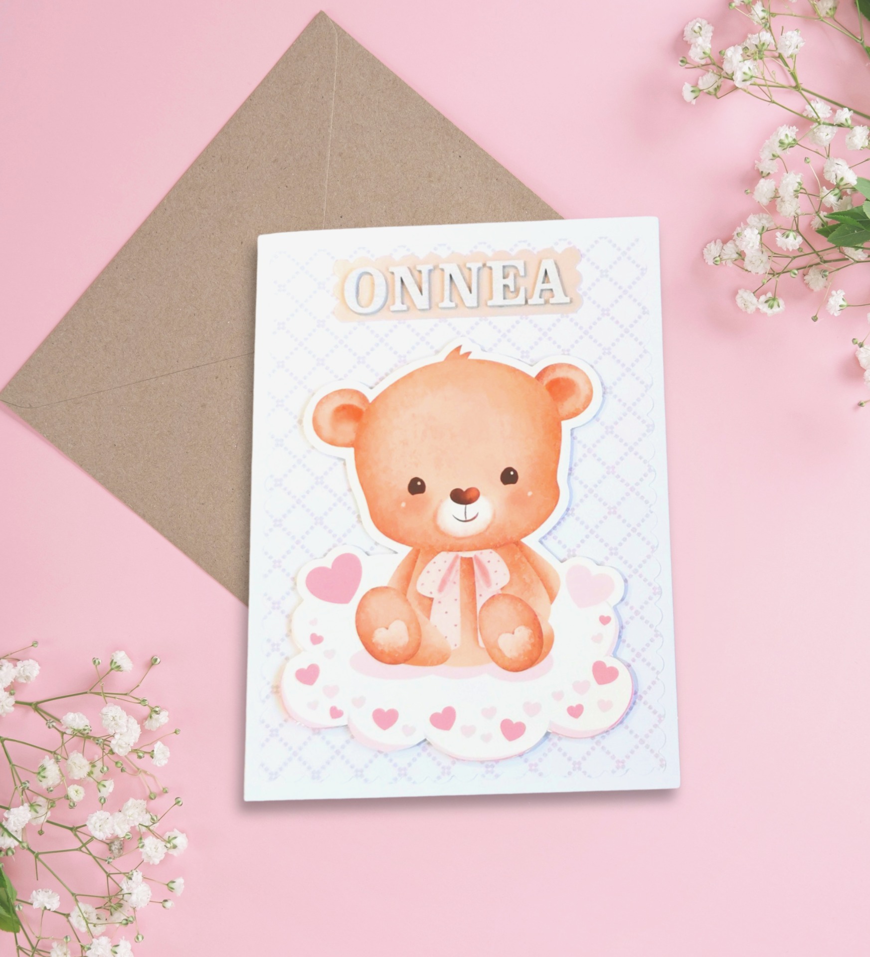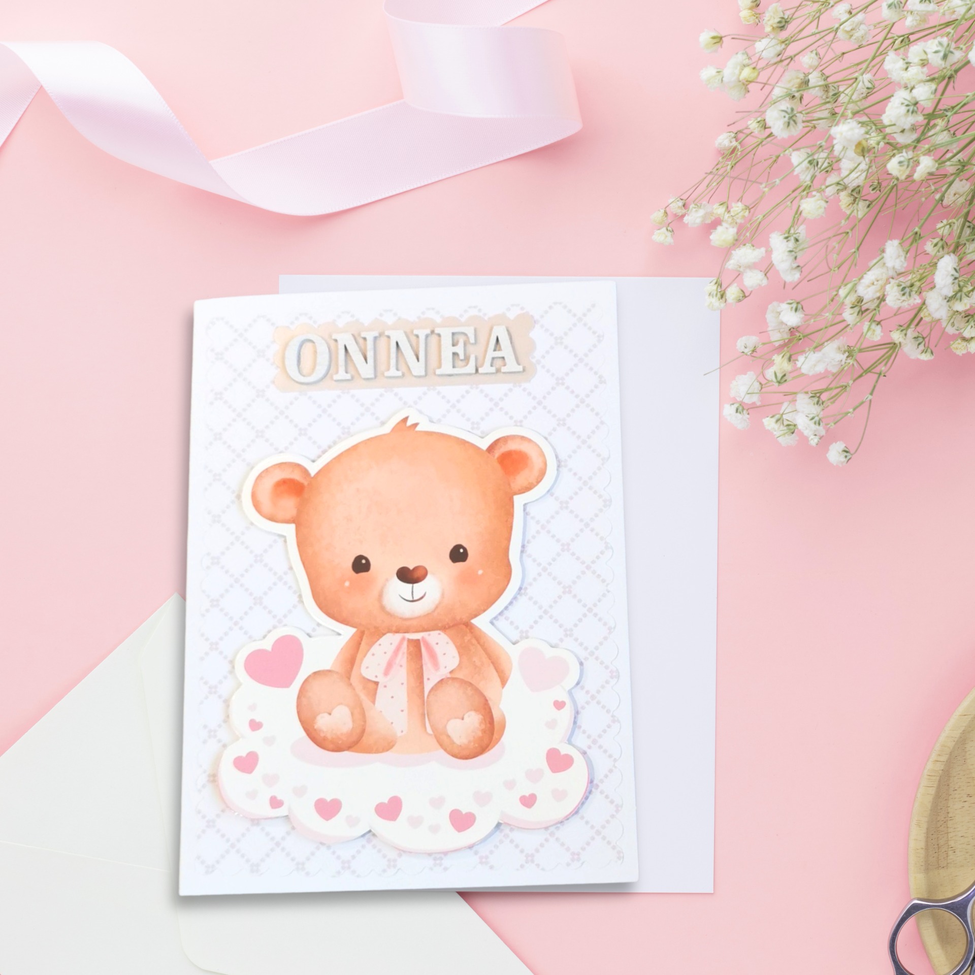 Kortin etuosaa koristaa koholla oleva nalle, joka tuo kuvitukseen kolmiulotteisuutta ja pehmeyttä. Yläosassa olevat puusta valmistetut kirjaimet ovat valkoisia ja niistä muodostuu teksti: "Onnea". Nallen alapuolella on skräppäyspaperista tehty tausta, jossa on vaaleanpunaisia ruutukuvioita. Kaikki osat ovat käsin kiinnitettyjä.