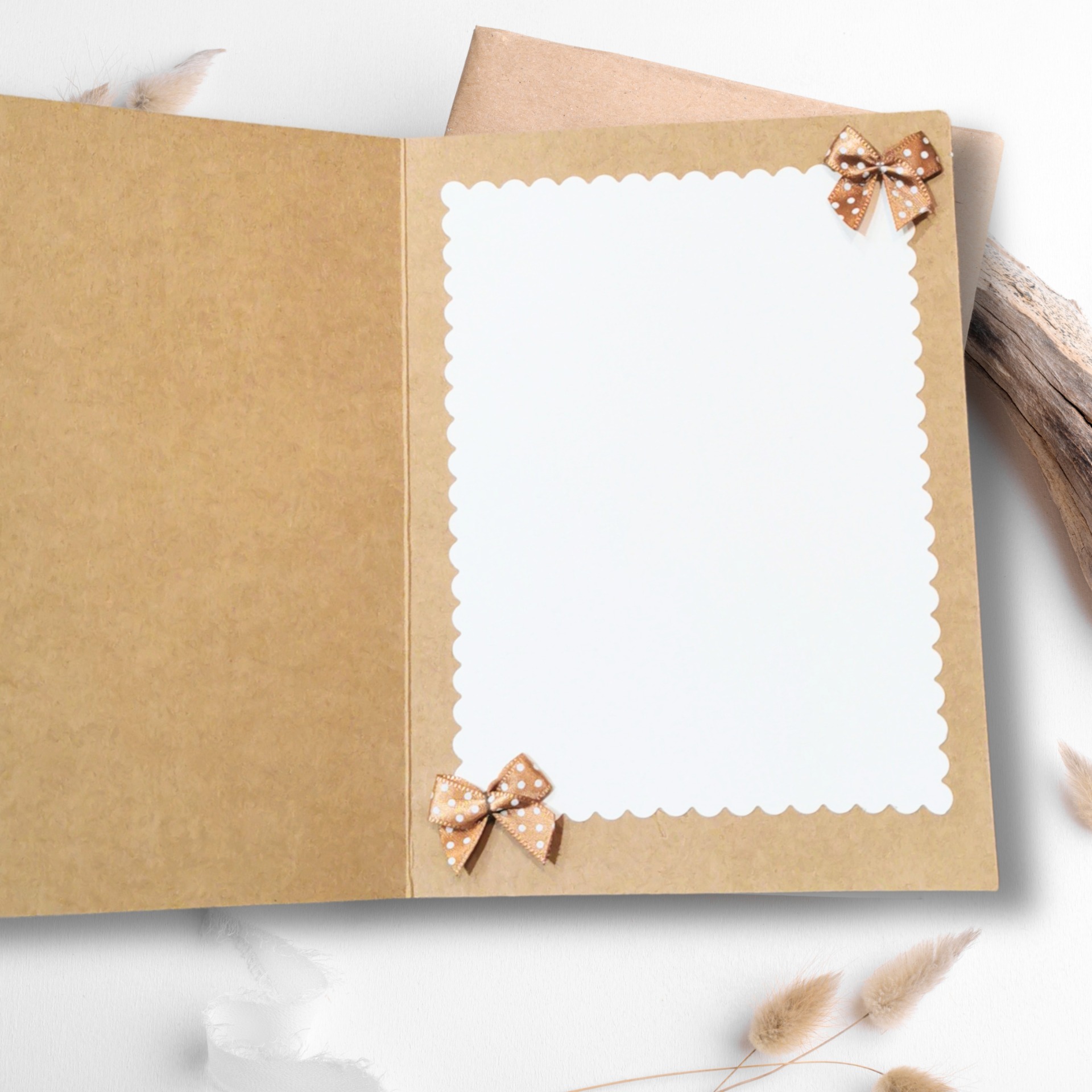 Luonnonruskea craft-kartonki, pitsireunainen sisäpaperi ja huolellisesti kiinnitetyt rusettiyksityiskohdat tekevät tästä kortista juhlavan.