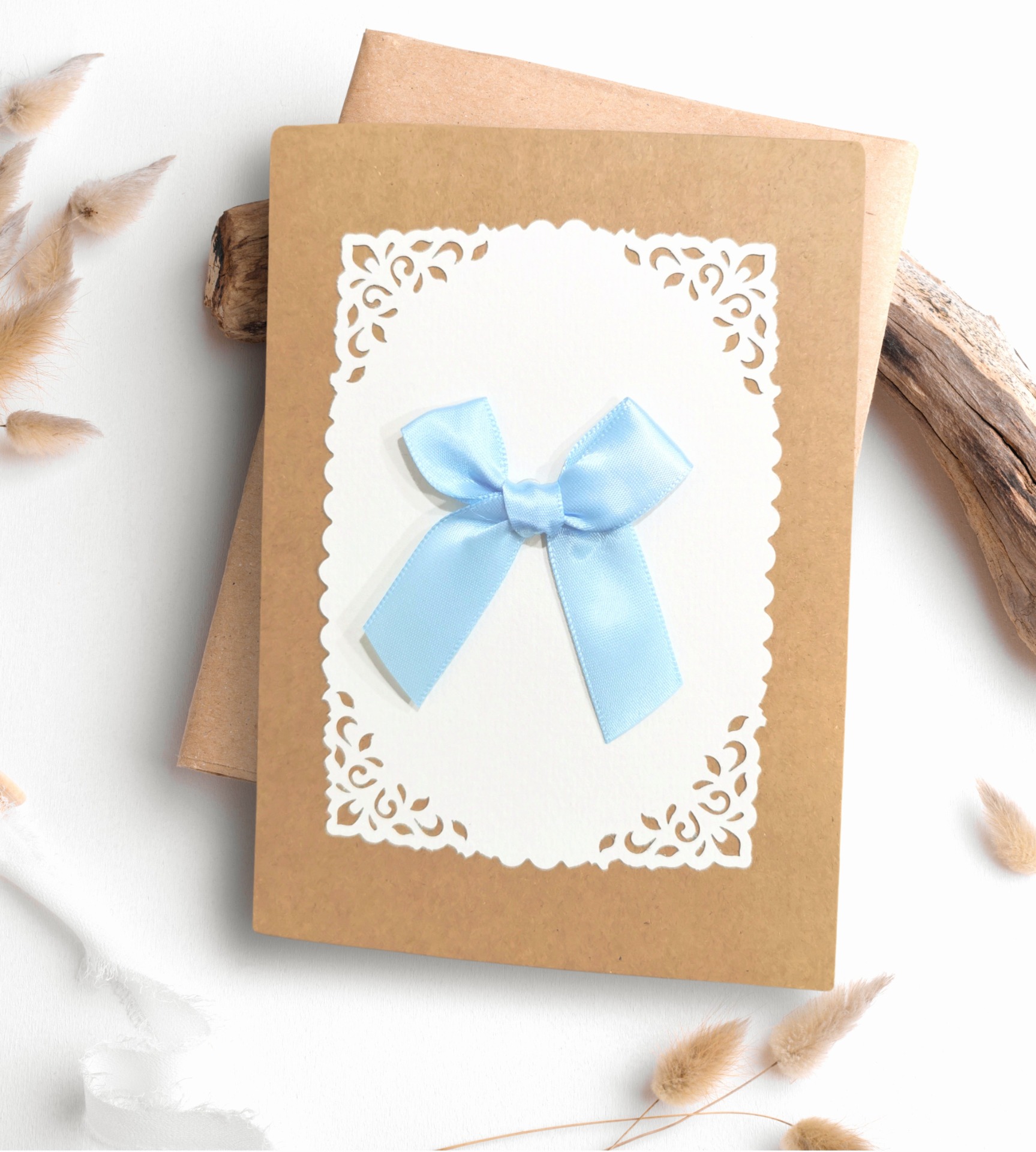 Kortin kannessa on vaaleansininen, hillitty rusetti, joka tuo kokonaisuuteen pehmeyttä ja juhlavuutta. Sisäpuolelle on kiinnitetty pitsireunainen kirjoituspinta omille sanoille sekä kaksi pientä rusettiyksityiskohtaa viimeistelemään ilmeen.