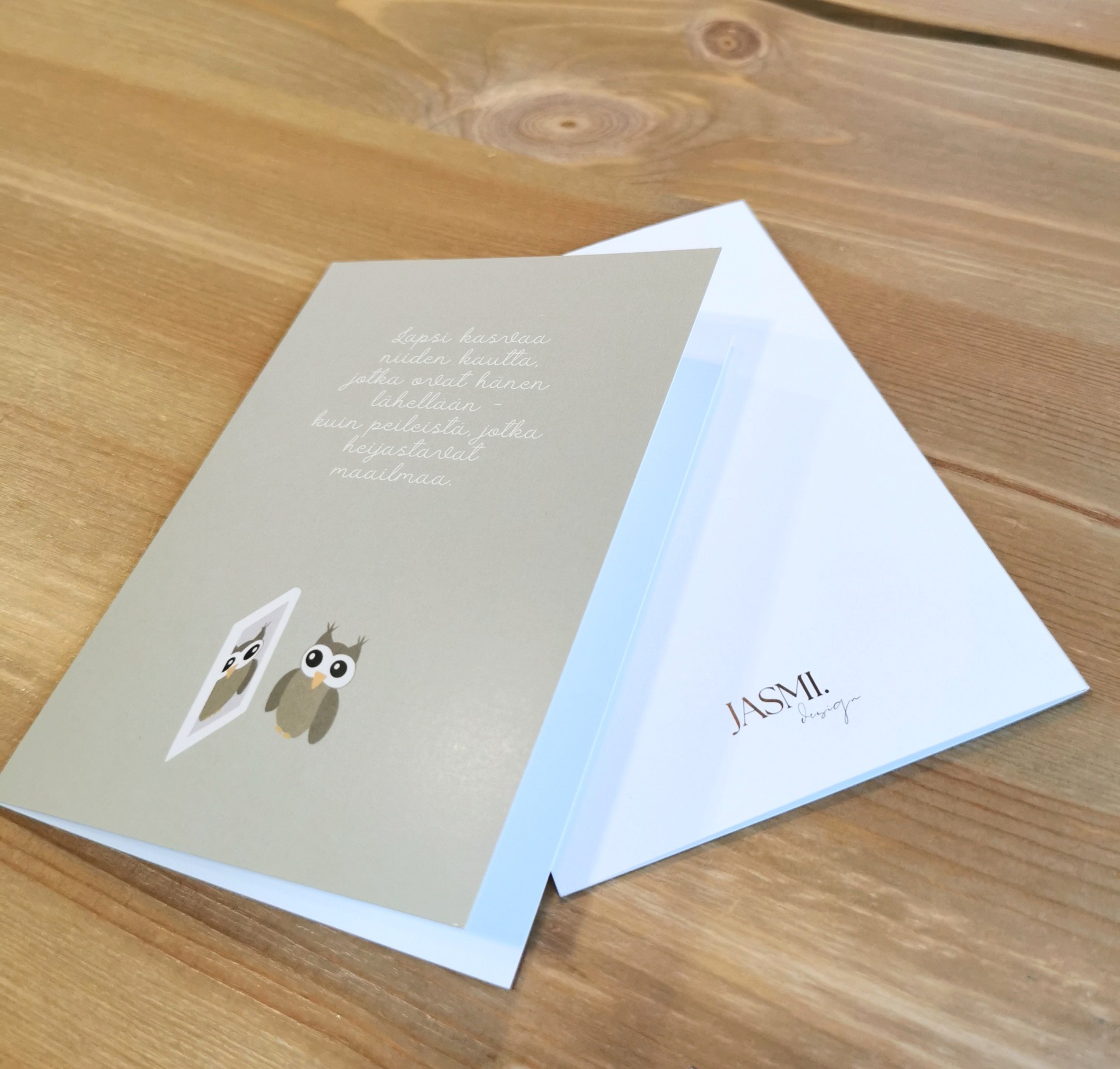 Kaunis ja ajatuksellinen kortti kummiksi kysymiseen tai vauvan syntymän juhlistamiseen. Kortin etupuolella seisoo pieni pöllö katsomassa omaa kuvaansa peilistä, ja teksti muistuttaa siitä, miten lapsi kasvaa ihmisten kautta, jotka ovat hänen lähellään. Herkkä ja merkityksellinen viesti, joka sopii täydellisesti korttiin, jolla haluat pyytää jonkun tärkeän ihmisen lapsesi rinnalle kulkemaan.