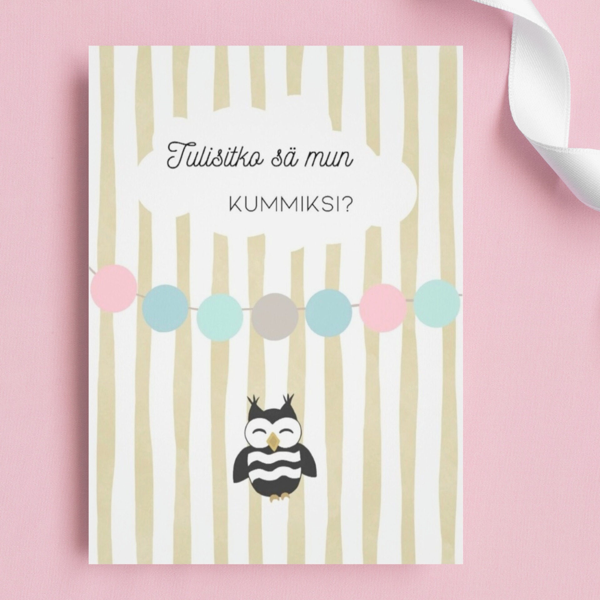 Suloinen ja lämminhenkinen kortti kummiksi pyytämiseen. Kortin etupuolella on iloinen pöllö ja teksti: "Tulisitko sä mun kummiksi?"