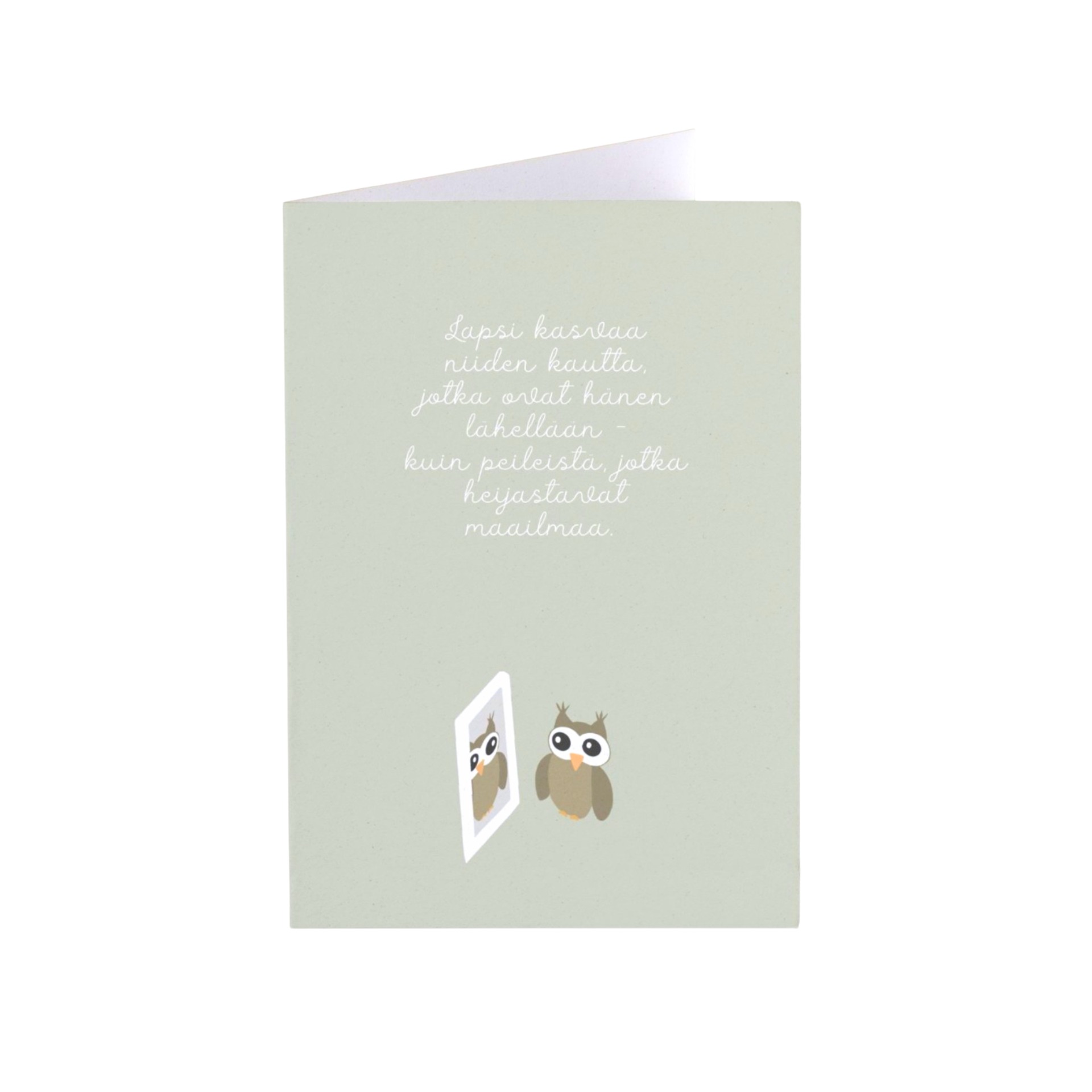 Kaunis ja ajatuksellinen kummikutsu. Kortin kannessa seisoo pieni pöllö katsomassa omaa kuvaansa peilistä ja teksti muistuttaa siitä, miten lapsi kasvaa ihmisten kautta, jotka ovat hänen lähellään. Jos mietit, kuinka pyytää kummiksi, niin tämä kortti sulattaa taatusti sydämen!