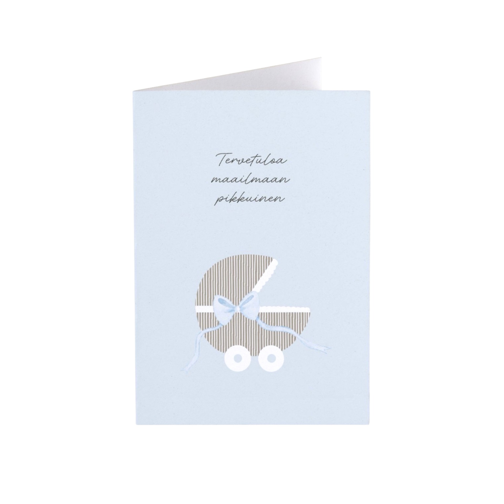 Kortin etupuolella on piirros vintage-tyylisistä vaunuista, joita koristaa pieni vaaleansininen rusetti. Tekstinä: "Tervetuloa maailmaan pikkuinen".