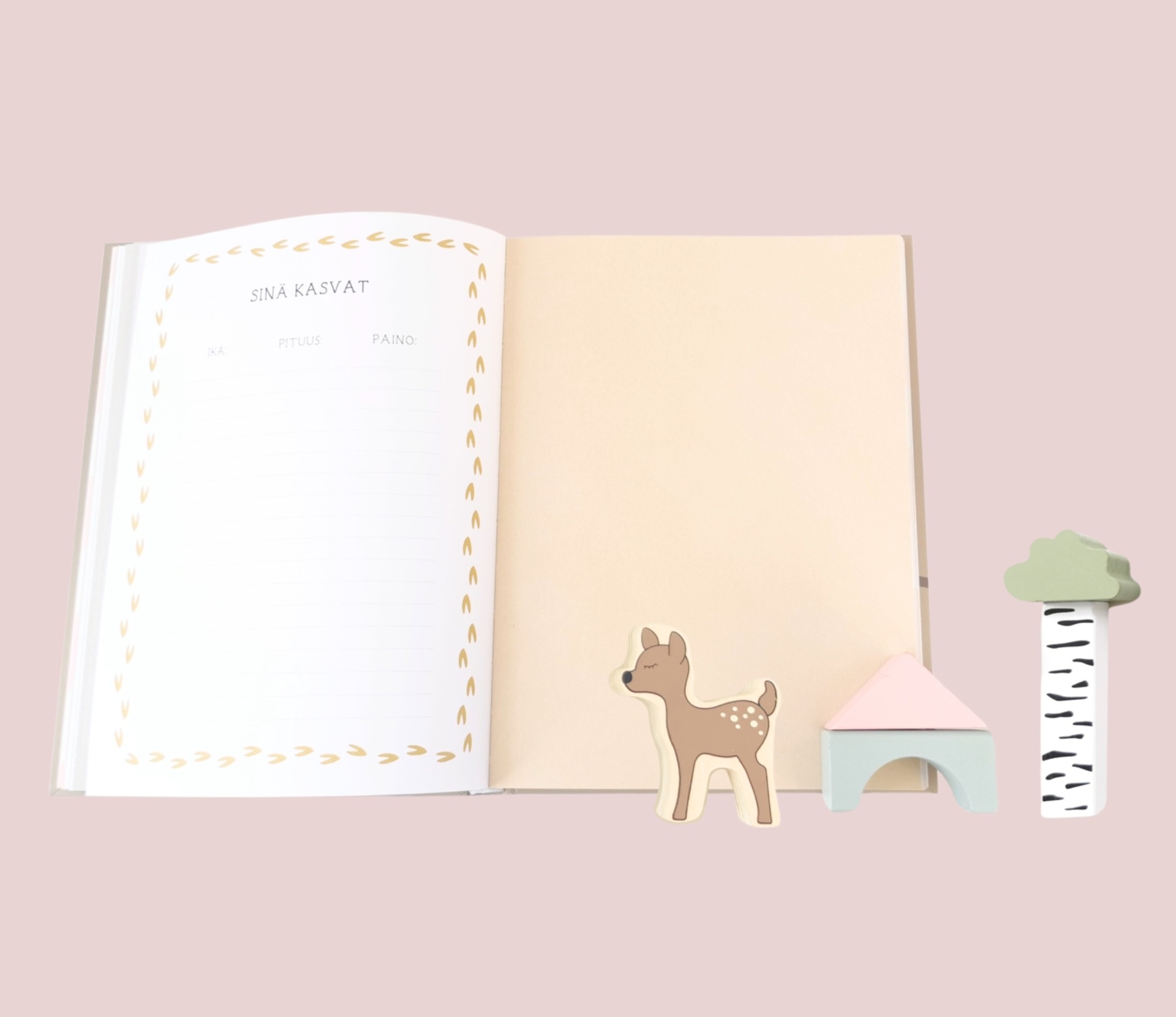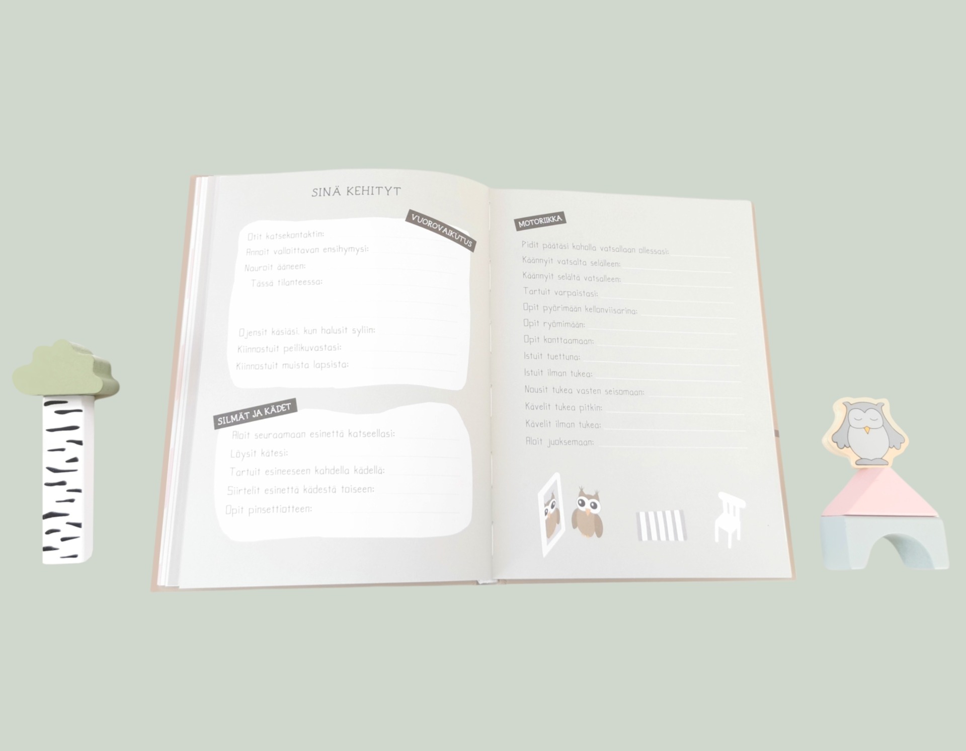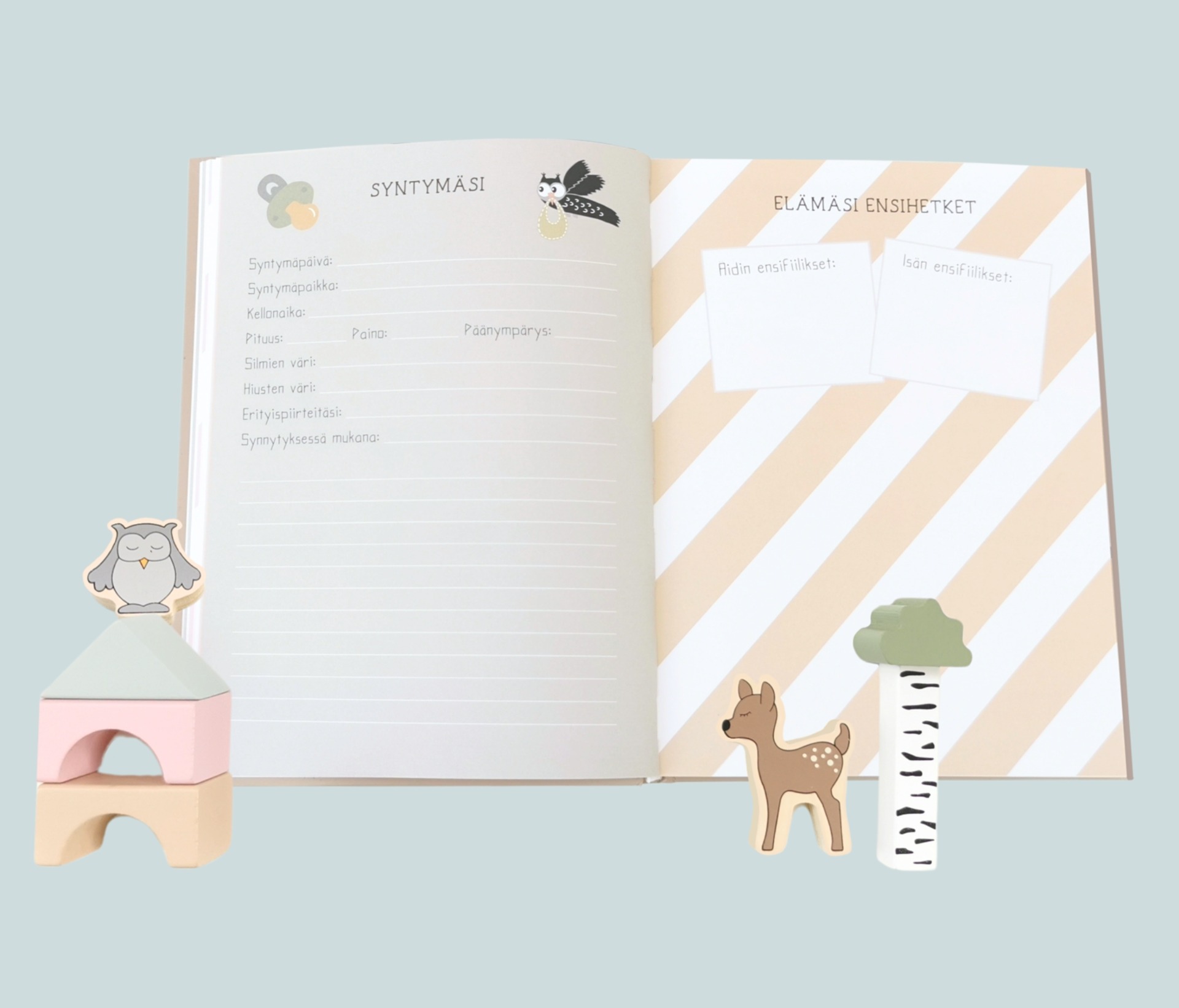 "Aivan ihana vauvakirja, johon saa kouluikään saakka muistelmia. Tämän sain vauvan isältä lahjaksi raskausaikana ja nyt on tilattava kyllä esikoiselle myös, ottaa se käyttöön ja laittaa vanhat sivuun."