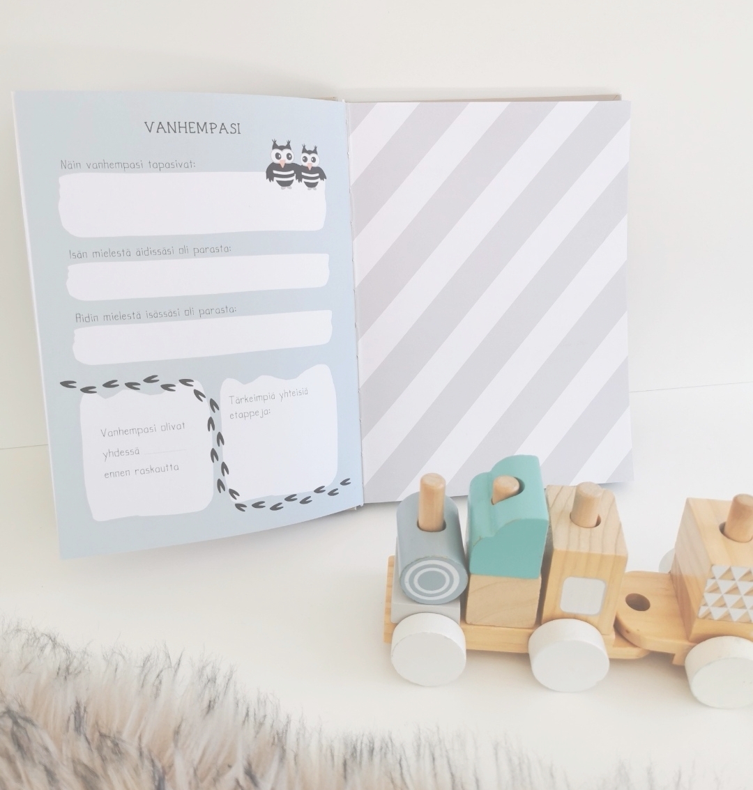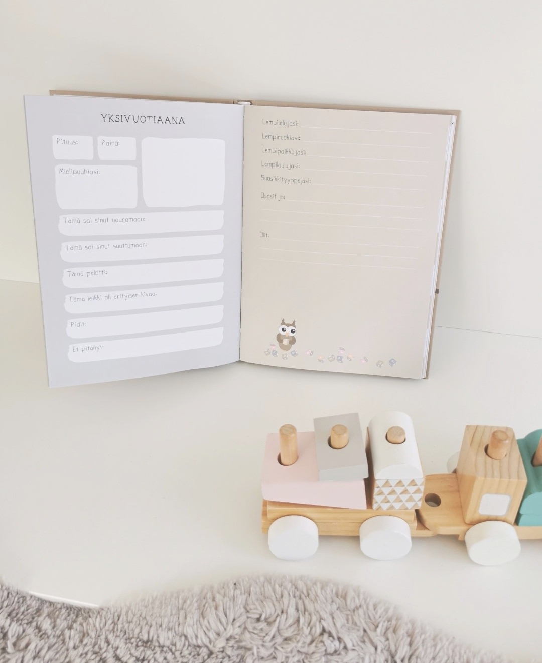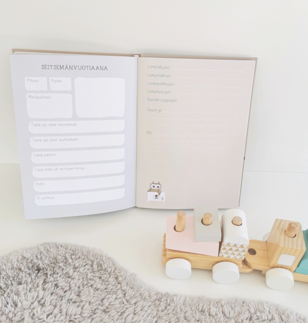 "Ihania sävyjä sivuissa ja söpöjä yksityiskohtia. Lämminhenkinen kirja johon saa monia muistoja kirjattua. Iso plussa myös tyhjistä sivuista, jotka voi täyttää vaikka kuvilla."