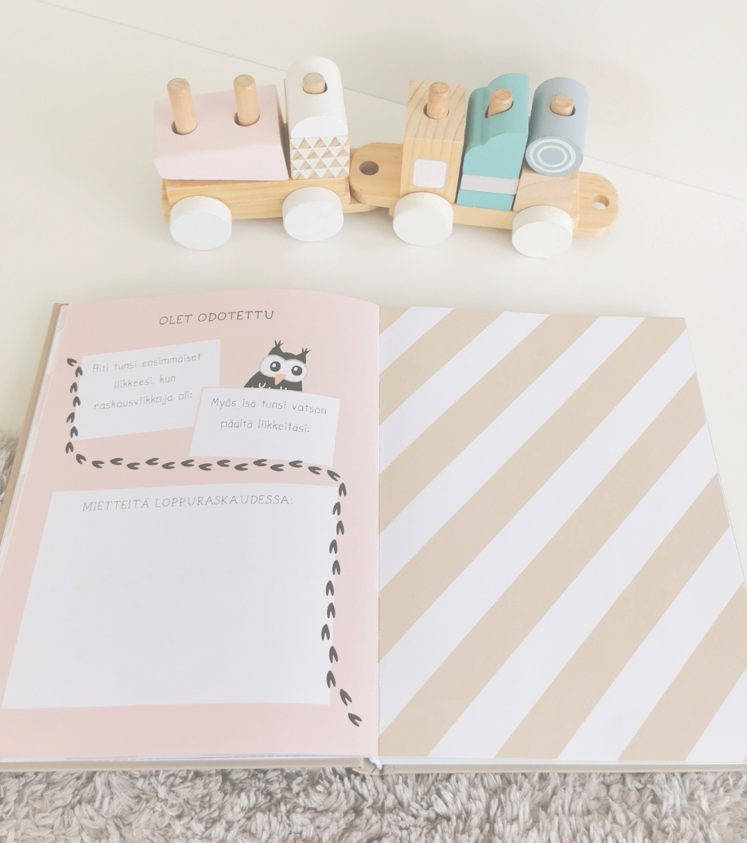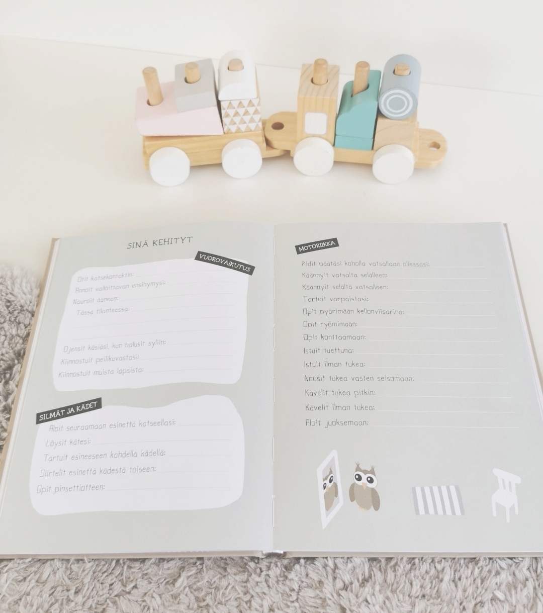 "Oon ettiny pitkään vauvakirjaa ja selaillut kaikkia mahdollisia vaihtoehtoja. Siks en meinannut melkein uskoa, kun Pieni rakas-vauvakirja tuli vastaan. Vihdoin sellanen vauvakirja, jossa on kaikki tarpeellinen. Siis oikeesti kaikki! Iso iso iso plussa siitäkin, että sivujärjestys on niin selkeä. Kuvitus on ihan valtavan ihana ja kirja on värikäs, mutta modernilla tavalla. Pastellinen ja maanläheinen. 🦉😍"