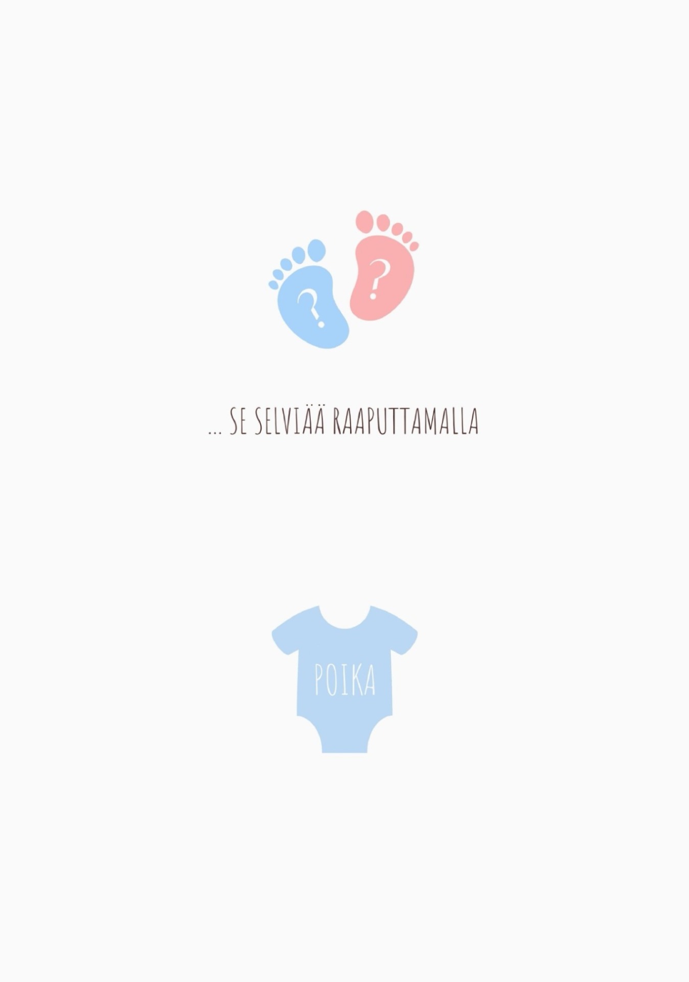 Kortti sopii täydellisesti sukupuolen paljastamiseen esimerkiksi isovanhemmille, kummille tai ystäville. Ulkoasu on neutraali, joten yllätys säilyy viimeiseen hetkeen asti.