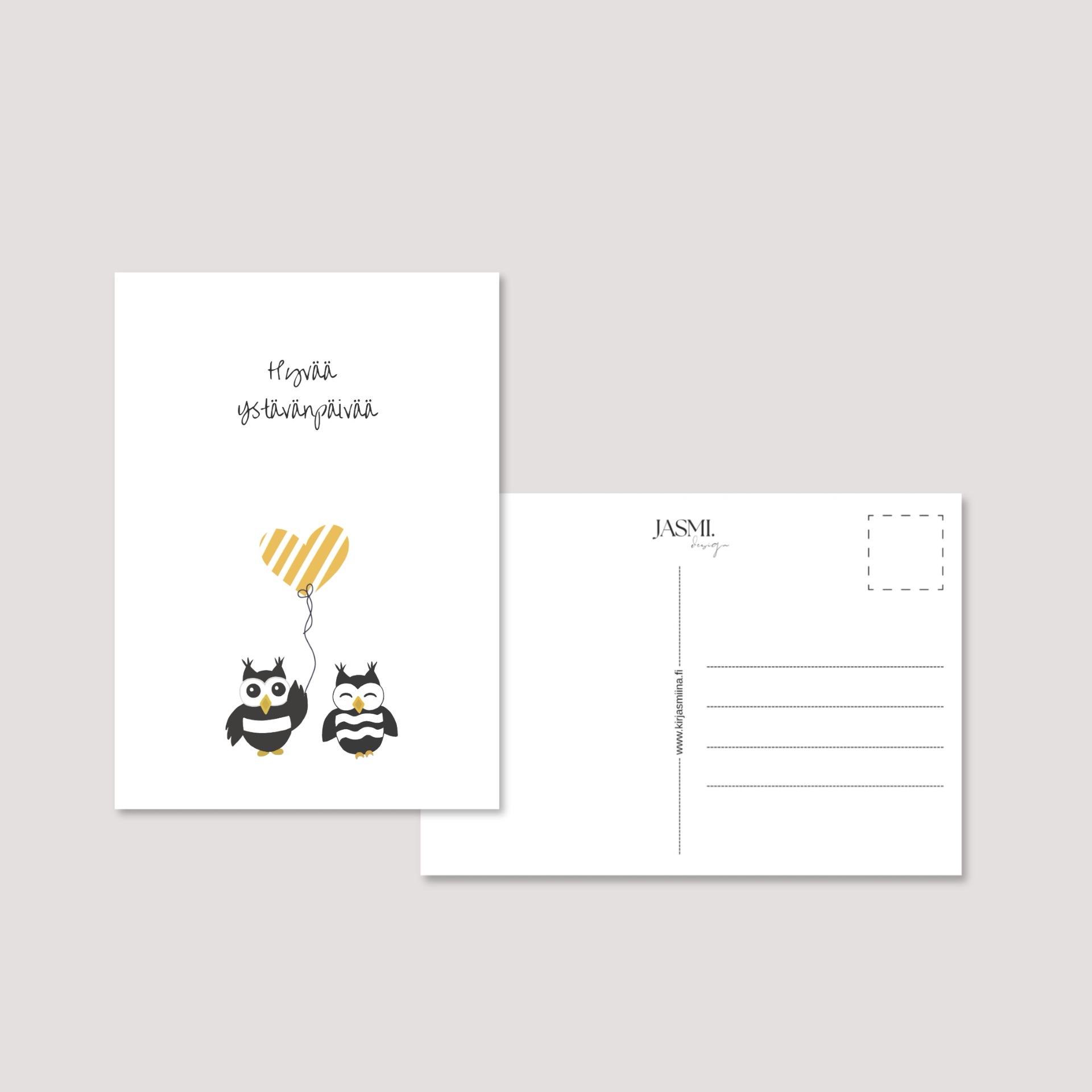 Postikorttipohjainen kääntöpuoli sisältää valmiit viivat osoitetta ja viestiä varten sekä hillityn JASMI.design -brändäyksen. Kortti on helppo lähettää sellaisenaan ilman kuorta, tai vaihtoehtoisesti voit käyttää mukana tulevaa craft-kirjekuorta viimeistellympään ilmeeseen.