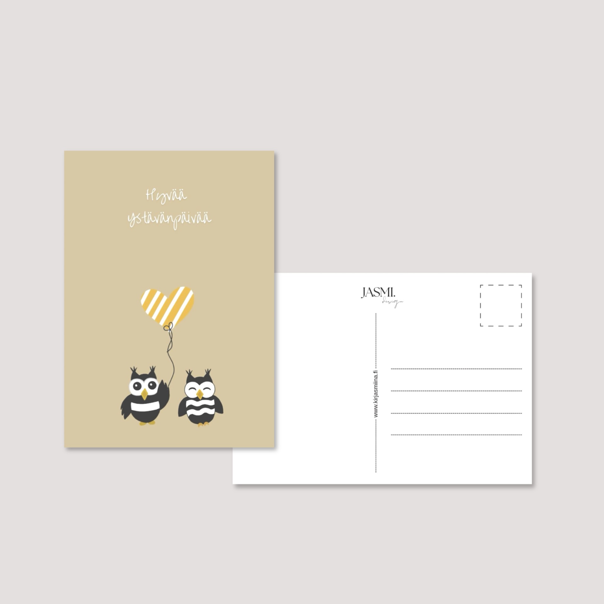 Herkän iloinen ja ajaton ystävänpäiväkortti, jossa kaksi pöllöä seisoo vierekkäin ja toinen niistä pitää kädessään sydämenmuotoista ilmapalloa.
